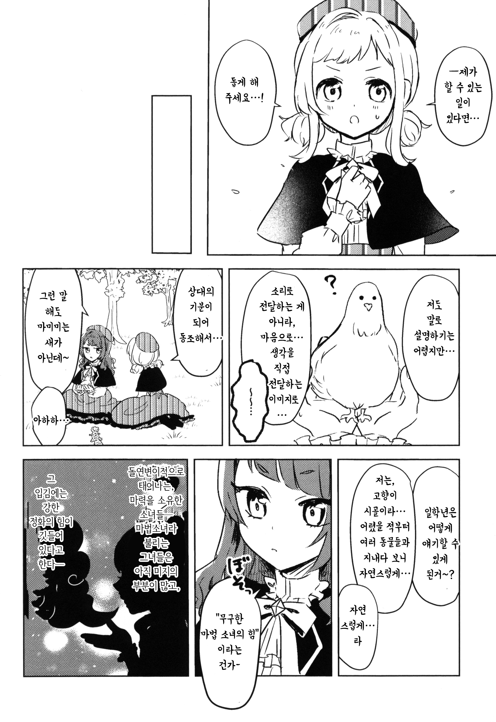 코가네의 마력이 모두의 손끝까지 가 닿는다. 빗자루 비행은 차치하고, 수화라든지 위성 마법이라든지 상형 마법이라든지는 지금의 그녀에게는 너무 고등해서, 그리 참고는 되지 않았다. 그런 그녀가 가장 먼저 습득한 것은, 견습마녀의 기초의 기초인, 마력을 나누어 주는 것. 촉진마법, 혹은 성원술이라고 불리는 이 마법들은, 마력을 주입한다는 점에서 모든 마법의 기초이며, 고등 마법사는 거의 대부분의 마법을 촉진 마법을 바탕으로 취급한다고 해도 좋을 정도다. 마력이 넘쳐나 어쩔 수 없는 그녀에게는 그야말로 안성맞춤인 마법이었다.