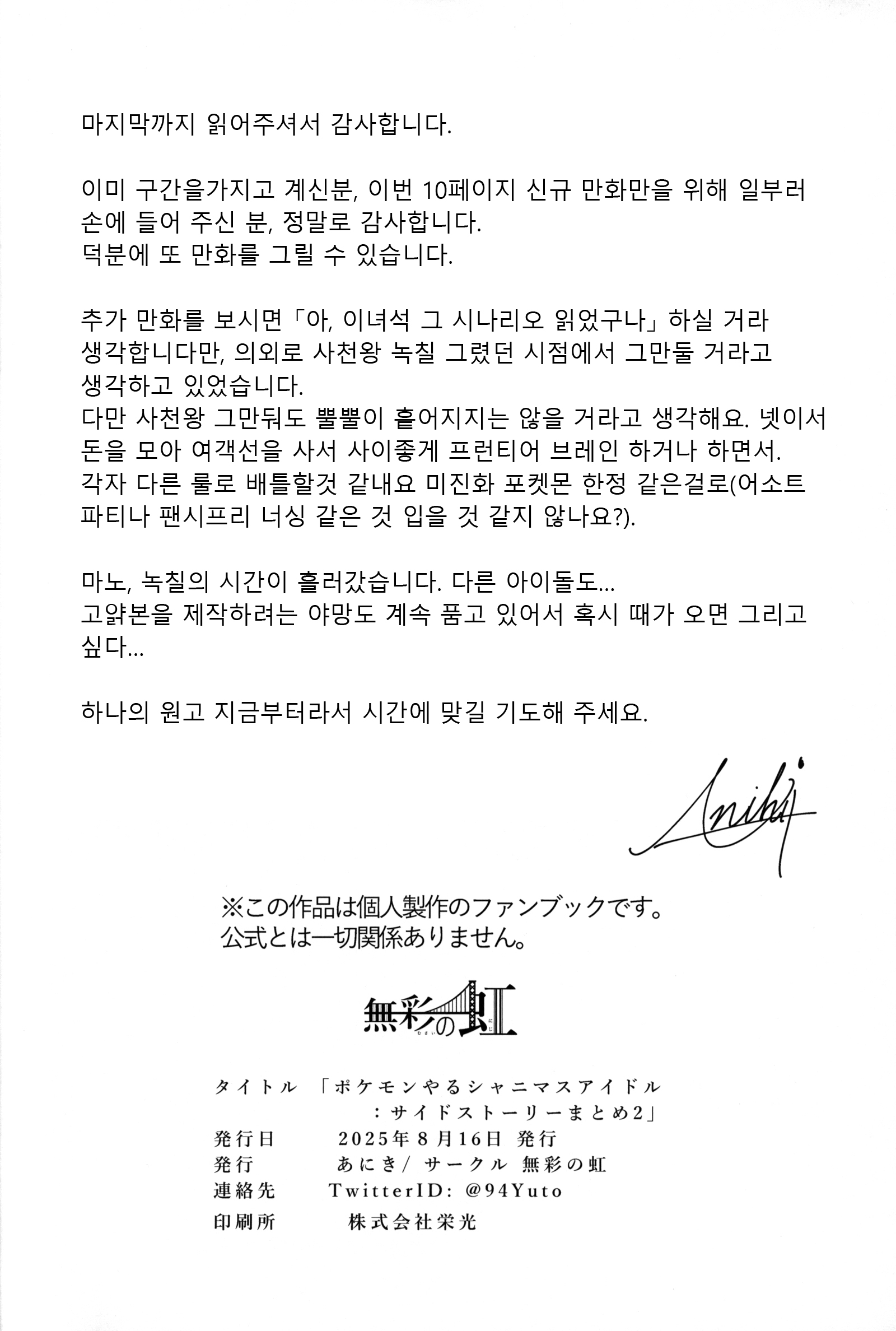 C106에서 나온 서클 무사이노니지의 포켓몬 시리즈 사이드스토리 모음집 2. 기존 책에 안 실렸던 부분이랑 신작 부분만. 갈수록 퀼리티가 진화하는 게 보여서 이 시리즈도 길었구나 싶었다.