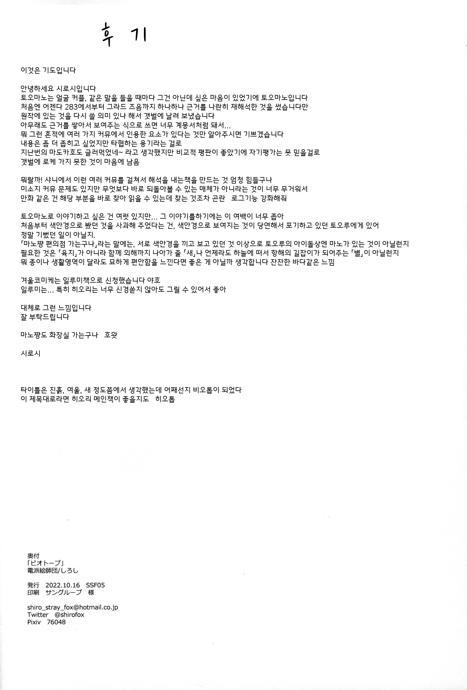 SSF05에서 나온 서클 전파화사단의 토오마노 책. 이 전부터도 일루미 그림으로 이미 일루미의 신이었던 분이지만 후기를 읽어보면 역시 남다르다 싶다. 누가 했어서 뒀었다가 총집편 재활용으로 슥슥.