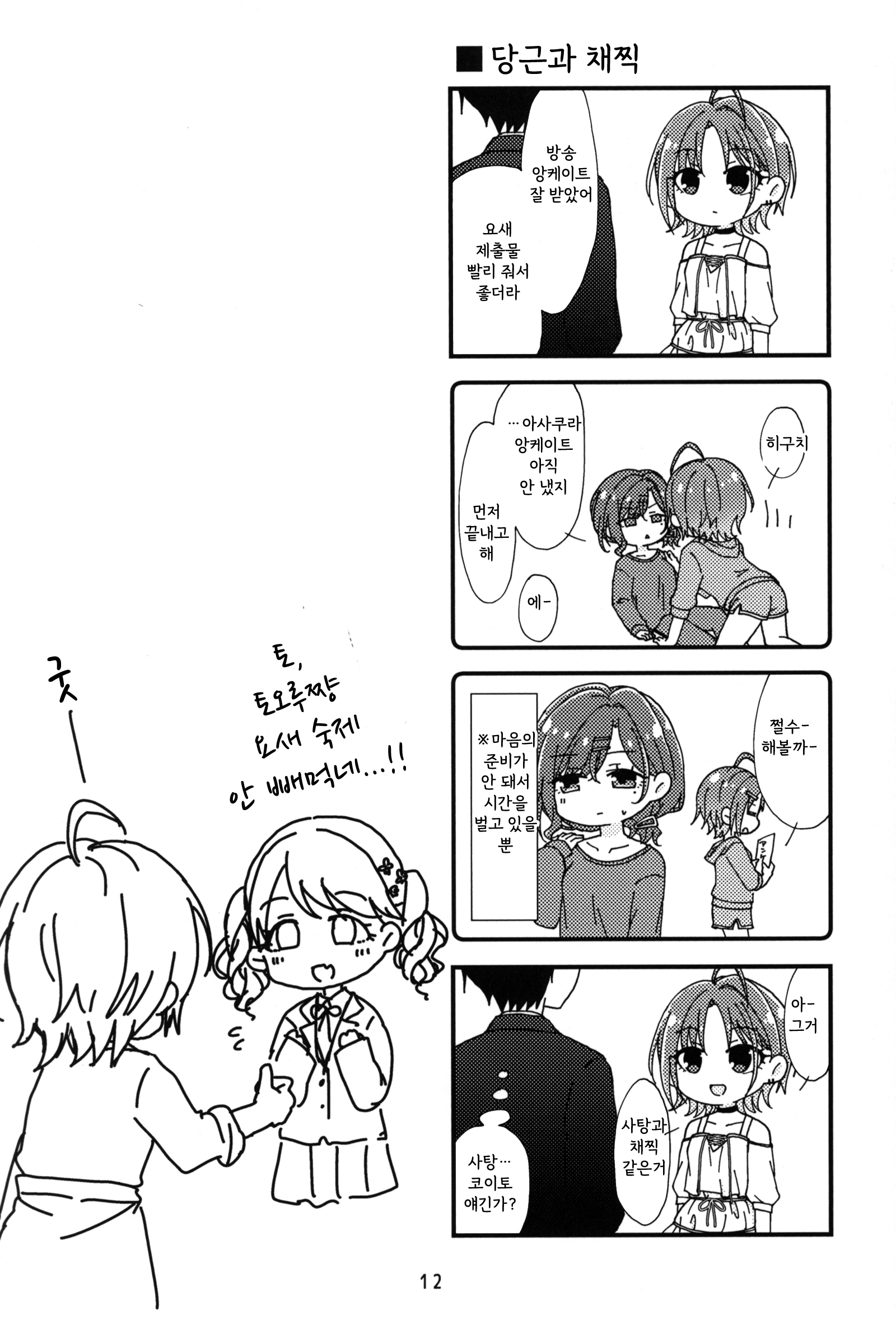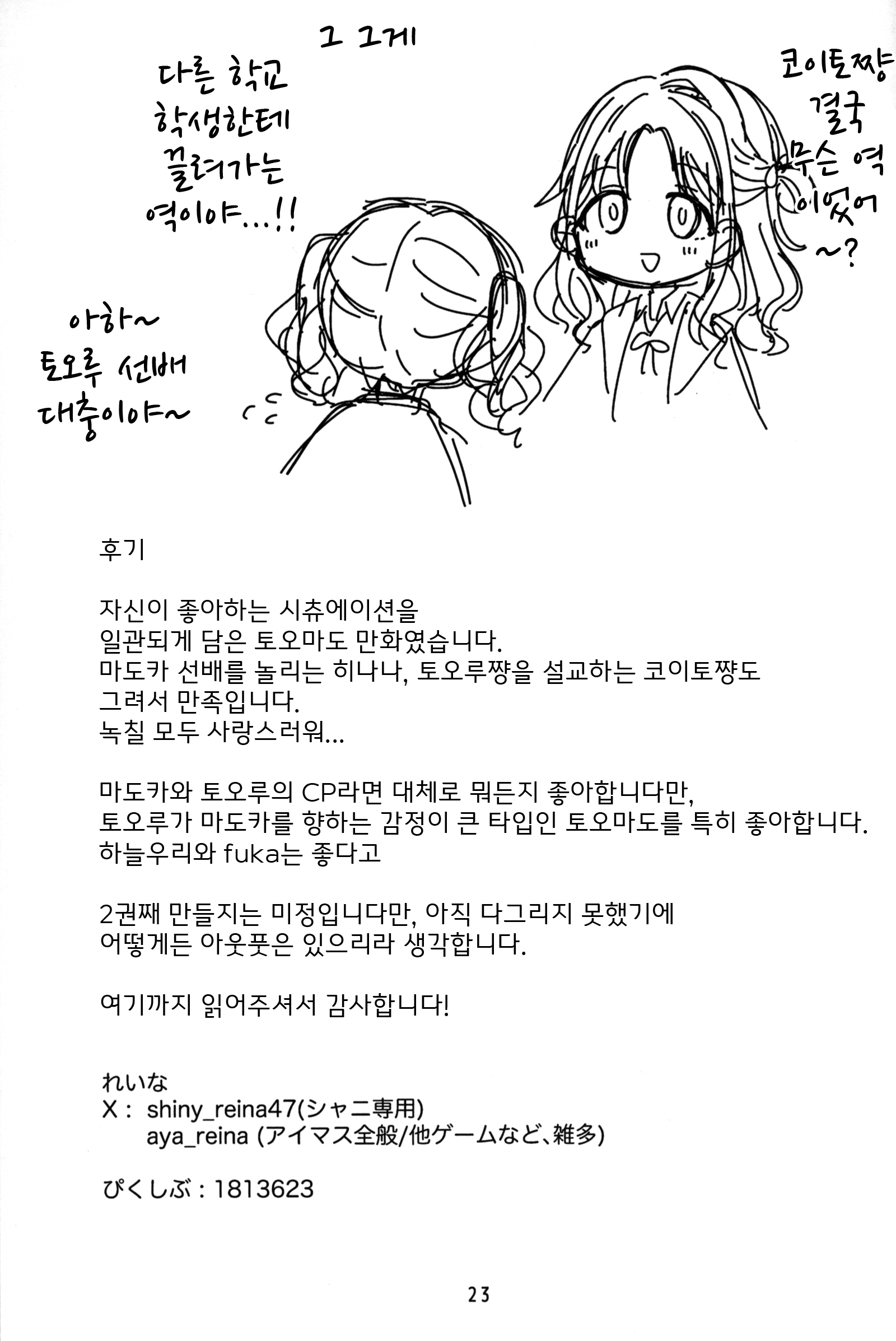 가희 40에서 나온 서클 유메타상승중의 토오마도 책. 토오마도의 관계성도 여러가지지만 순한맛?은 이거처럼 뭐야 평소와 다를 바 없잖아, 라는 느낌일까. 아니 그럼 평소에도 사귀는 중이던가?