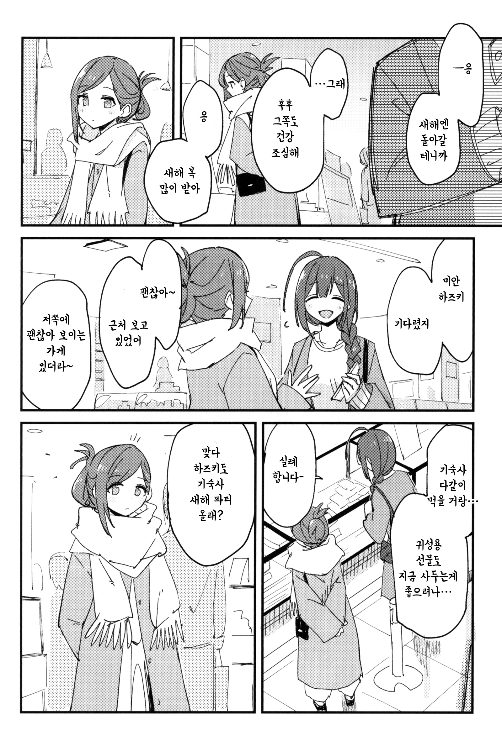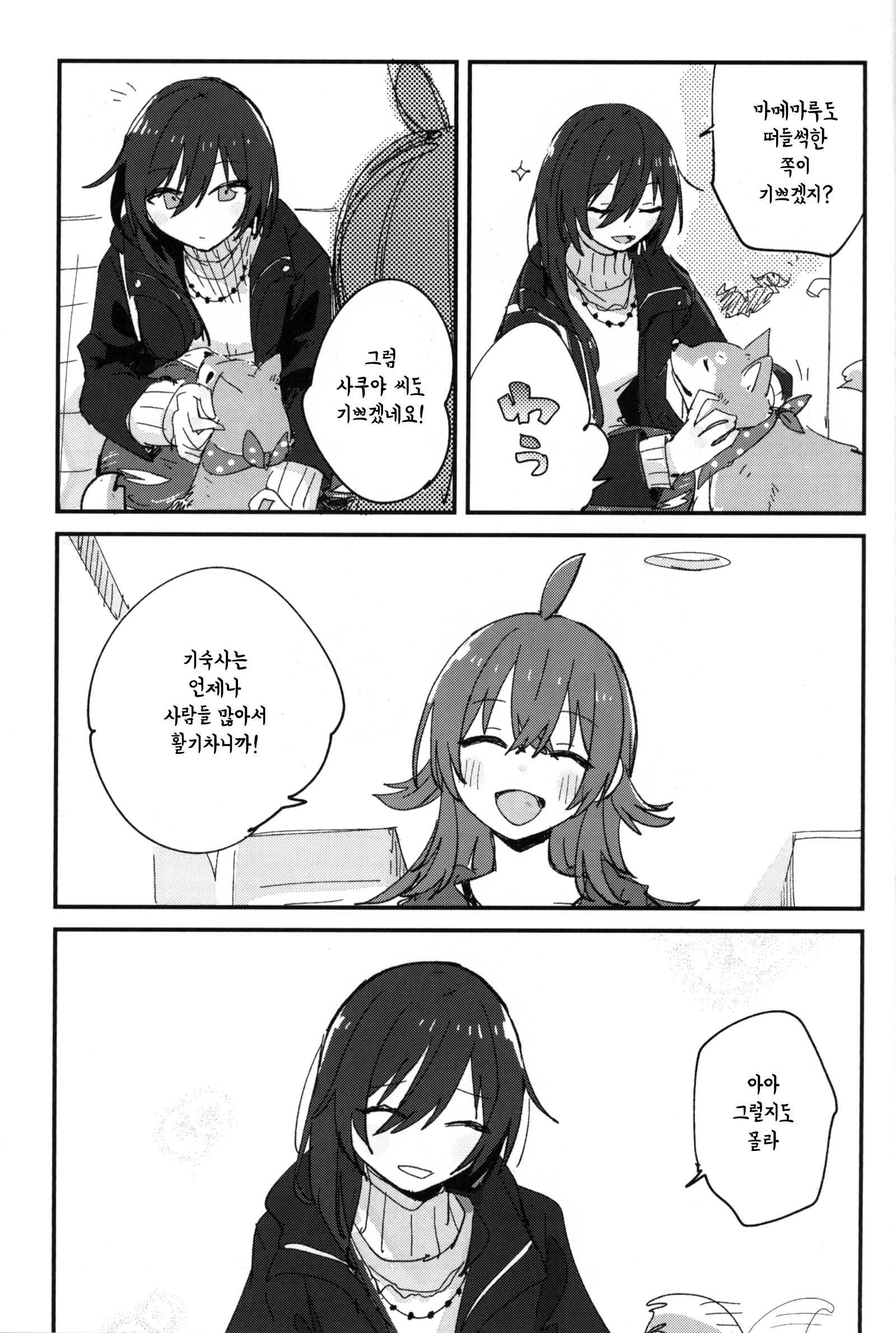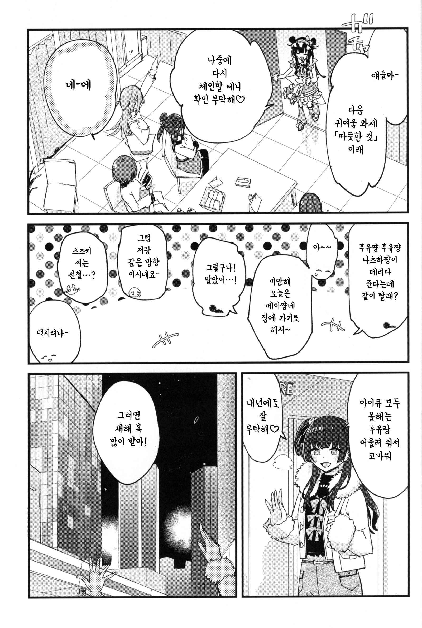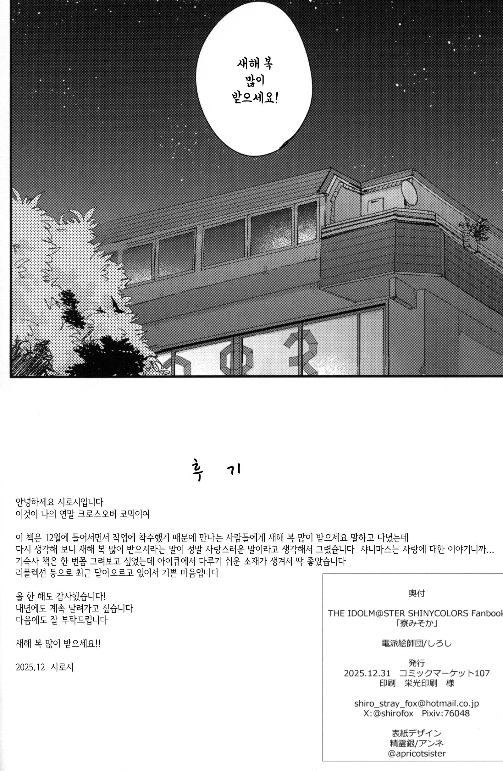 C107에서 나온 서클 전파화사단의 기숙사 설맞이 책. 일본어로는 연말인사인 좋은 한해를~ 이랑 새해인사인 새해 복 많이 받으세요~ 가 다르지만 그냥 자주 쓰는 표현으로 통일했다. 치어리딩 키리코 그리고싶어서 끼워넣은 부분이 너무 어이없어서(?) 웃겼어. 28+3명 다 그려준 것도 정말정말 고마웠다.