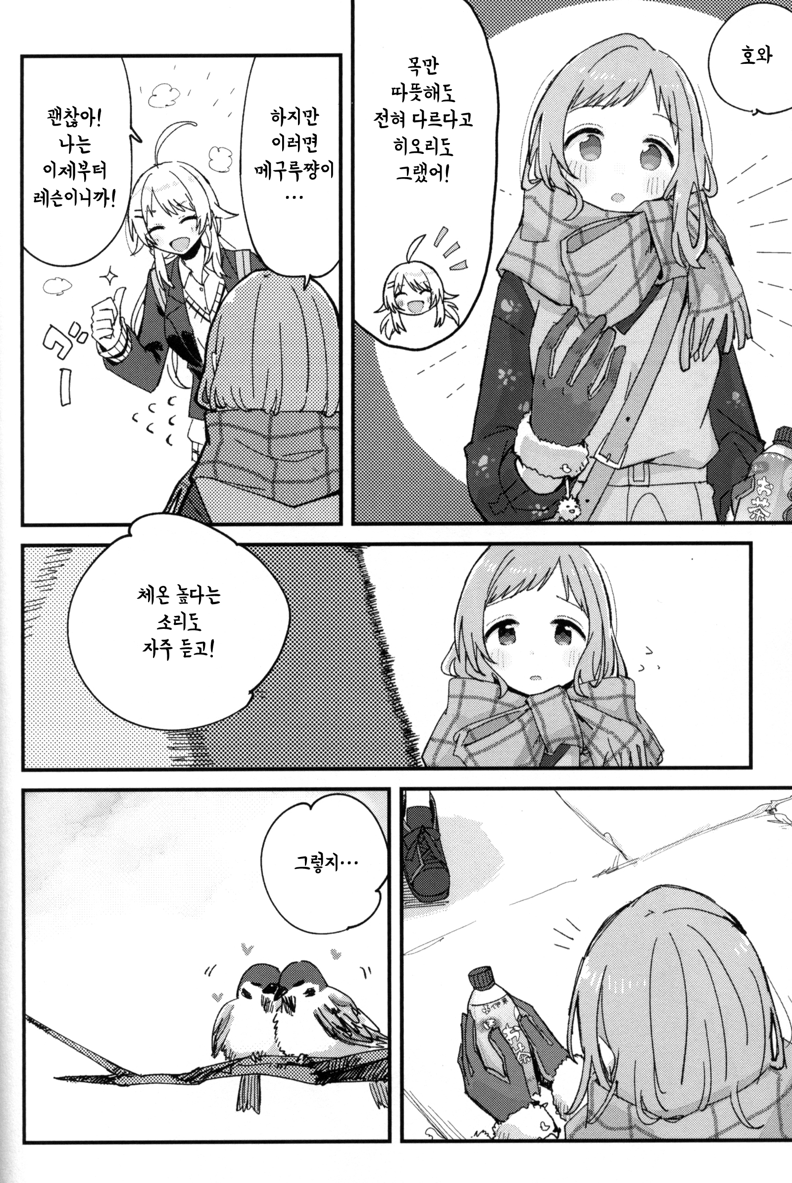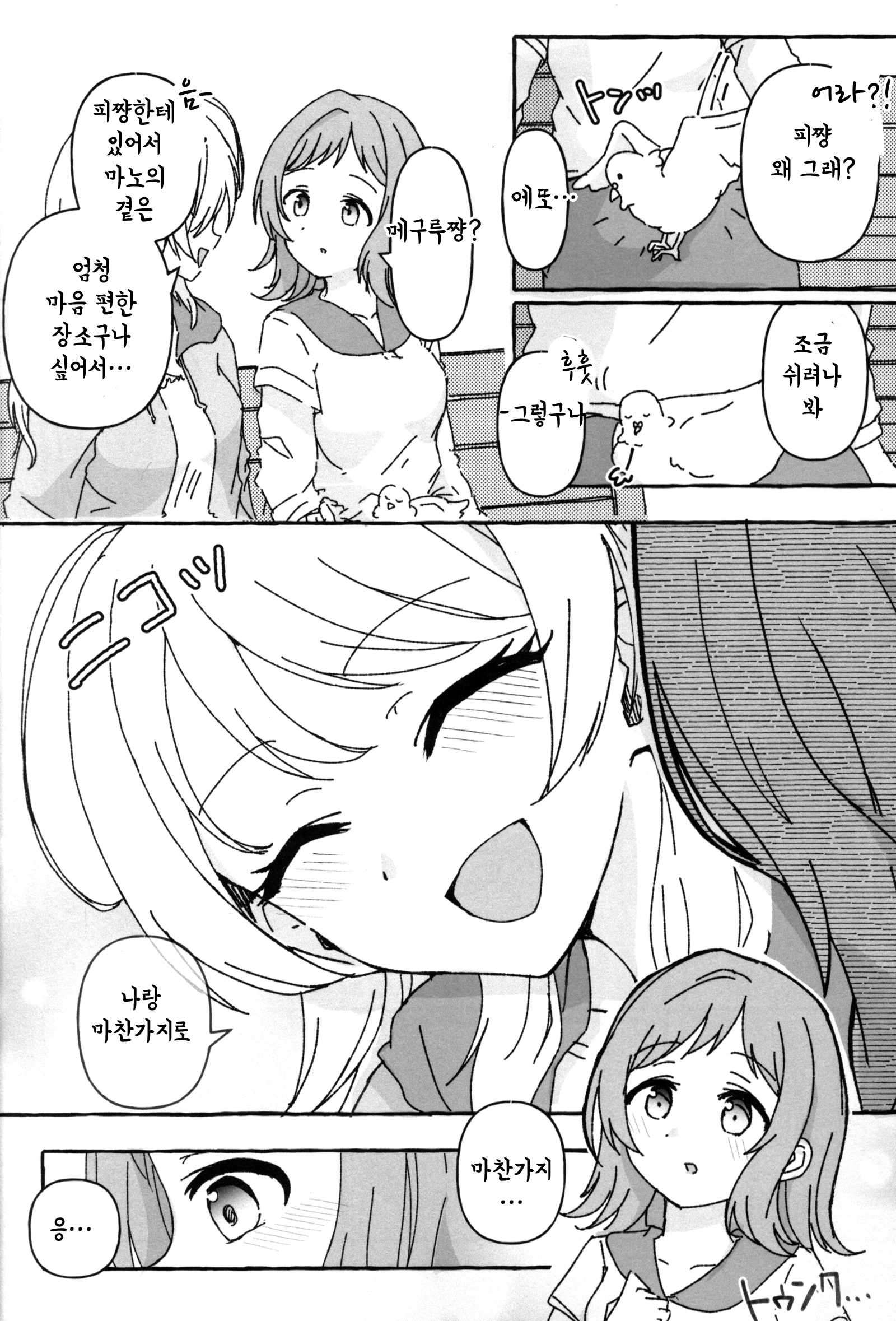 역시 급작스러워서 그런지, 마노도 처음엔 깜짝 놀란 기색이었지만. 금세 익숙하고 친근한 어조로, 비둘기들에게 말을 걸고 있었다.