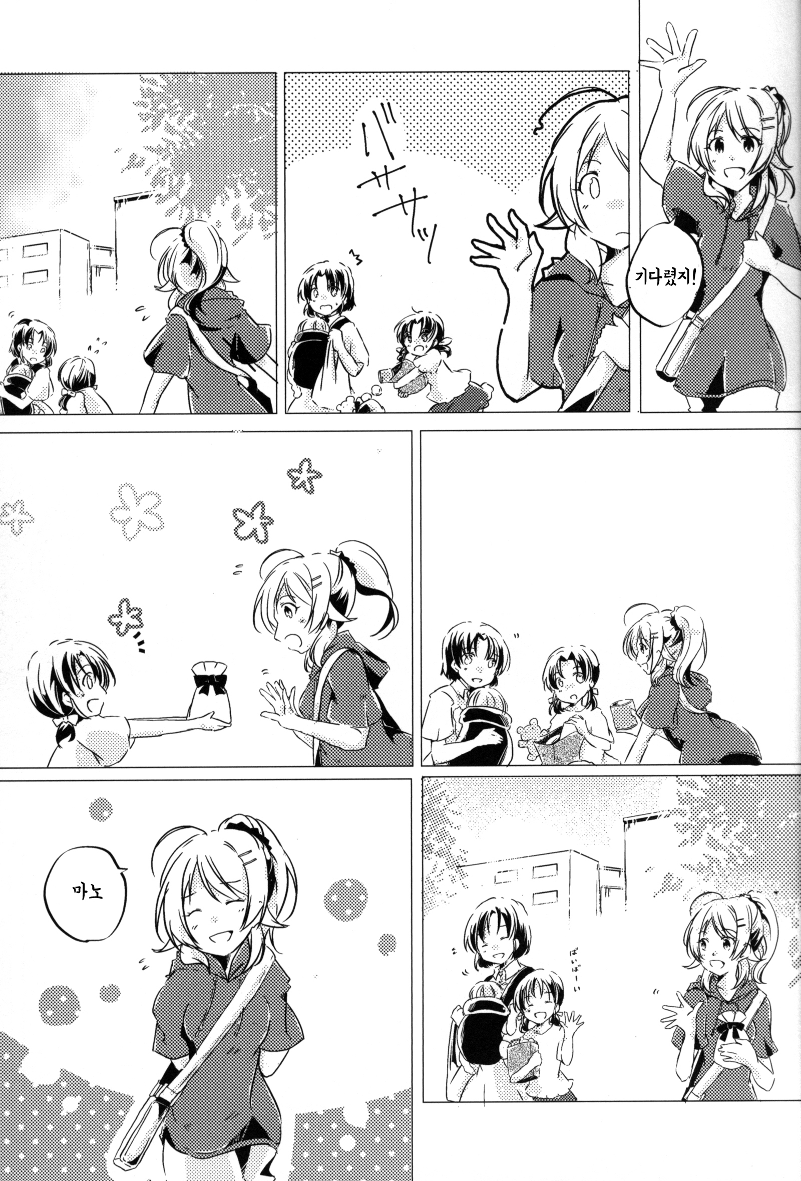 그 자리에서 멈춰 섰다가 몇 걸음 뒤에 있는 마노 쪽을 돌아보며 크게 손을 흔든다. 곧 마노가 따라잡고, 이번에는 둘이서 나란히 걷기 시작했다.